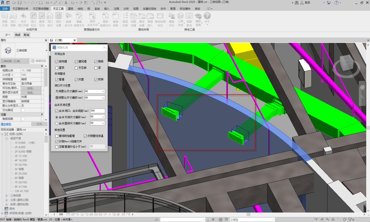 支持協(xié)同操作,識別當前項目或鏈接文件中的機電管線,完成管線穿越構(gòu)筑物時開洞的操作,支持機電管線密集處進行合并開洞,支持對鏈接文件進行更新從而刷新洞口,支持洞口關聯(lián),支持對洞口進行標注并統(tǒng)計。