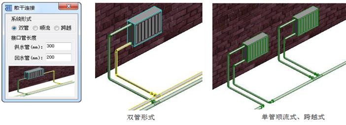 【散干連接】:可實現(xiàn)散熱器與干管的連接,支持雙管系統(tǒng),單管順流式和單管跨越式系統(tǒng)形式。支持設置自動生成的支管的管線長度。