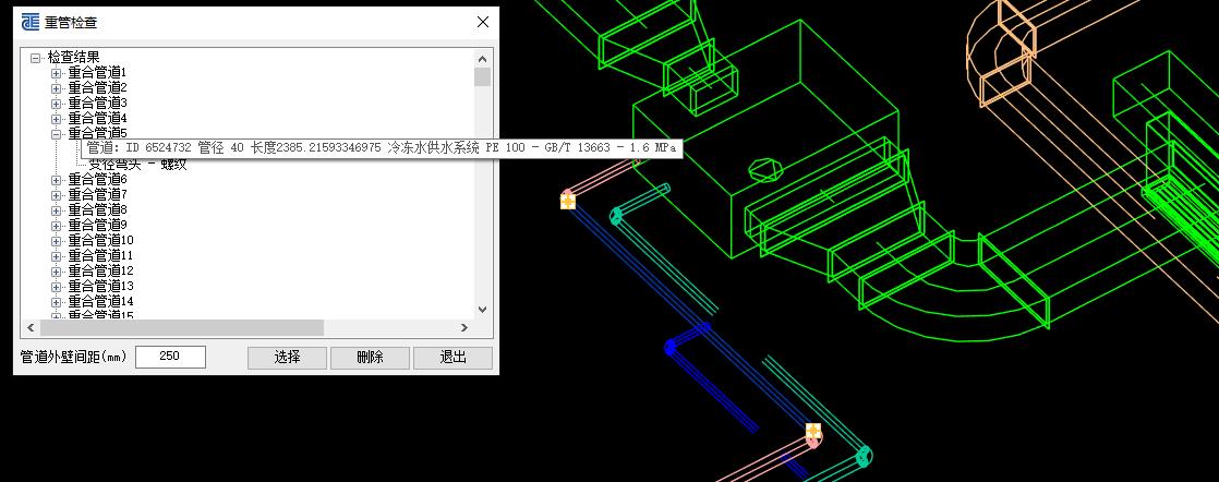 水系統(tǒng)管線編輯及調(diào)整:軟件提供對管道的編輯功能,支持通過管道刷批量修改管道參數(shù),支持批量生成、刪除管道保溫操作。軟件可以通過對齊、對正、管線等距等功能快速完成管線的微調(diào)操作,通過管線避讓功能快速完成碰撞構(gòu)件的避讓調(diào)整操作,通過管線貼梁功能一鍵完成管線貼梁、貼板操作,重管檢測命令可以方便快捷的檢測到項目中重合管線并進行定位亮顯,該命令用于檢查項目中某距離范圍內(nèi)的管道重合情況,對重合管線定位亮顯可以有效實現(xiàn)對重合管線進行修改。
