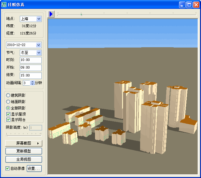 日照仿真:應用三維渲染技術,提供可視化的日照仿真,直觀指導建筑規(guī)劃,并可作為最具說服力的日照計算驗證。提供選擇需要生成陰影的建筑物、只顯示投影在建筑外表面上的陰影、屏幕截圖等功能。