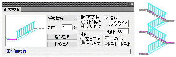 除自動(dòng)生成立剖面以外,程序還提供有獨(dú)立的立剖面繪制編輯工具,如繪制剖面參數(shù)樓梯。