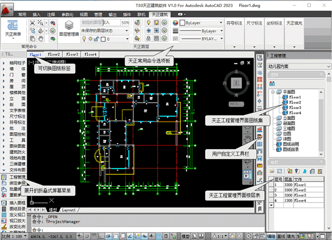 天正建筑引入了工程管理概念,工程管理器將圖紙集和樓層表合二為一,將與整個(gè)工程相關(guān)的建筑立剖面、三維組合、門(mén)窗表、圖紙目錄等功能完全整合在一起,同時(shí)進(jìn)行工程圖檔的管理,無(wú)論是在工程管理器的圖紙集中還是在樓層表雙擊文件圖標(biāo)都可以直接打開(kāi)圖形文件。