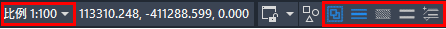 狀態(tài)欄的比例控件可設(shè)置當(dāng)前比例和修改對(duì)象比例,提供了編組、墻基線(xiàn)顯示、加粗、填充和動(dòng)態(tài)標(biāo)注 (對(duì)標(biāo)高和坐標(biāo)有效) 控制。
