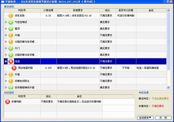 軟件提供生成計(jì)算書前標(biāo)準(zhǔn)檢查,顯示不滿足規(guī)定性指標(biāo)的圍護(hù)結(jié)構(gòu),對(duì)于居住建筑,進(jìn)一步提示能否進(jìn)行耗熱量指標(biāo)計(jì)算,對(duì)于需要?jiǎng)討B(tài)計(jì)算的公共建筑,提供節(jié)能檢查,方便設(shè)計(jì)師調(diào)整節(jié)能方案。