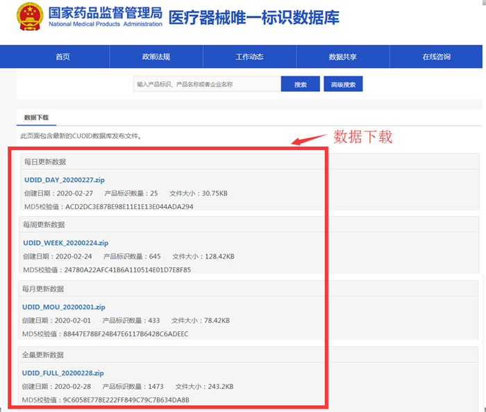 醫療器械唯一標識數據庫設置了數據下載功能,點擊首頁“數據共享”欄目進入“數據下載”功能頁面(圖3所示),提供全量、每月、每周、每日等批量數據包下載,同時提供數據包的創建時間、數據條數、文件大小等內容。
