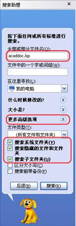注意左邊幾個打紅圈的地方,如果你機(jī)子上“更多高級選項(xiàng)”旁邊的箭頭是向下的,需要點(diǎn)一下箭頭,讓它變成如圖所示的形狀,此時下邊會打開下級選項(xiàng),注意最下面一個紅圈中的三個地方一定要打勾。然后在最上面一個紅圈的位置處輸入需要搜索的文件名,一共有四個文件需要搜索,分別是acad.lsp,acaddoc.lsp,acadapp.lsp和acadiso.lsp,因?yàn)槊看沃荒芩阉饕粋€文件,所以得重復(fù)四遍這個搜索過程,最后把搜出來的文件全部刪除。