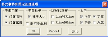 在AutoCAD格式刷的基礎(chǔ)上增加了本軟件的專用功能;按熱鍵[Q]可以彈出“格式刷特殊圖元處理選項(xiàng)”對(duì)話框(如圖),在通過格式刷傳遞圖元特征時(shí),這些選項(xiàng)可以改變:門窗的樣式、寬度、名稱;柱子的大小;LINE轉(zhuǎn)PLINE,PLINE轉(zhuǎn)LINE;文字內(nèi)容、名稱、樣式。