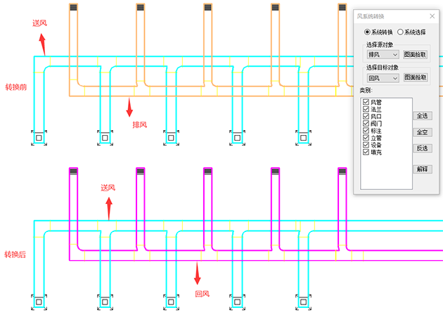 風(fēng)系統(tǒng)轉(zhuǎn)換命令,支持不同風(fēng)系統(tǒng)間的整體轉(zhuǎn)換,或整體選中。更高效,更快捷的在多個風(fēng)系統(tǒng)交叉的圖紙中選中所需要的風(fēng)系統(tǒng),進行移動、復(fù)制或整體轉(zhuǎn)換風(fēng)系統(tǒng)類型等操作。