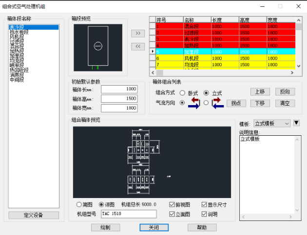 空氣機組命令支持模版的設(shè)置和保存。軟件中給出默認(rèn)立式和臥式模版,支持用戶手動添加。