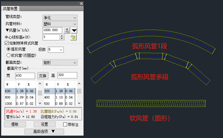 風(fēng)管繪制對話框采用可折疊樣式,節(jié)省了繪圖空間、使重點參數(shù)突出顯示;風(fēng)管繪制提供保溫、防火、內(nèi)襯層的繪制、勾選,及材質(zhì)選定、厚度設(shè)定;風(fēng)管繪制可根據(jù)風(fēng)量和風(fēng)管設(shè)置中設(shè)置的風(fēng)管推薦風(fēng)速,計算出風(fēng)管的推薦截面尺寸;風(fēng)管繪制支持不同壓力等級繪制,后續(xù)風(fēng)管材料統(tǒng)計根據(jù)不同壓力等級區(qū)分風(fēng)管壁厚;圓形風(fēng)管支持軟風(fēng)管繪制。
