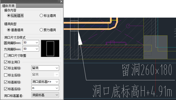 提供墻體開洞功能,自動讀取天正墻體和風(fēng)管的交點,自動生成洞口,同時提供不同的洞口樣式,同步生成洞口標(biāo)注信息,增加支持門窗對象下的墻體開洞操作。