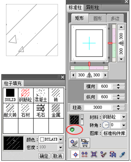 2. 天正【標(biāo)準(zhǔn)柱】命令對話框中提供了圖案填充的設(shè)置,可以在繪制柱子的同時完成圖案填充。在【標(biāo)準(zhǔn)柱】對話框中打開填充開關(guān),(程序會根據(jù)當(dāng)前所選柱子材料自動對應(yīng)填充圖案)繪制出的柱子即帶填充圖案。